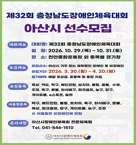 - 제32회 충청남도장애인체육대회 아산시선수단 모집안내 2026-03-30
