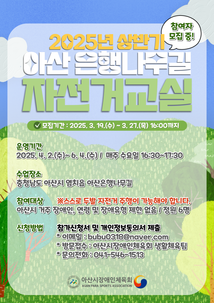 매년 상하반기 나누어 진행하던 인기 야외 수업인 자전거교실!관심 있는 분께서는 이미지와 첨부파일을 꼼꼼히 확인하신 후, 이메일 또는 방문하여 서류제출 부탁드립니다.