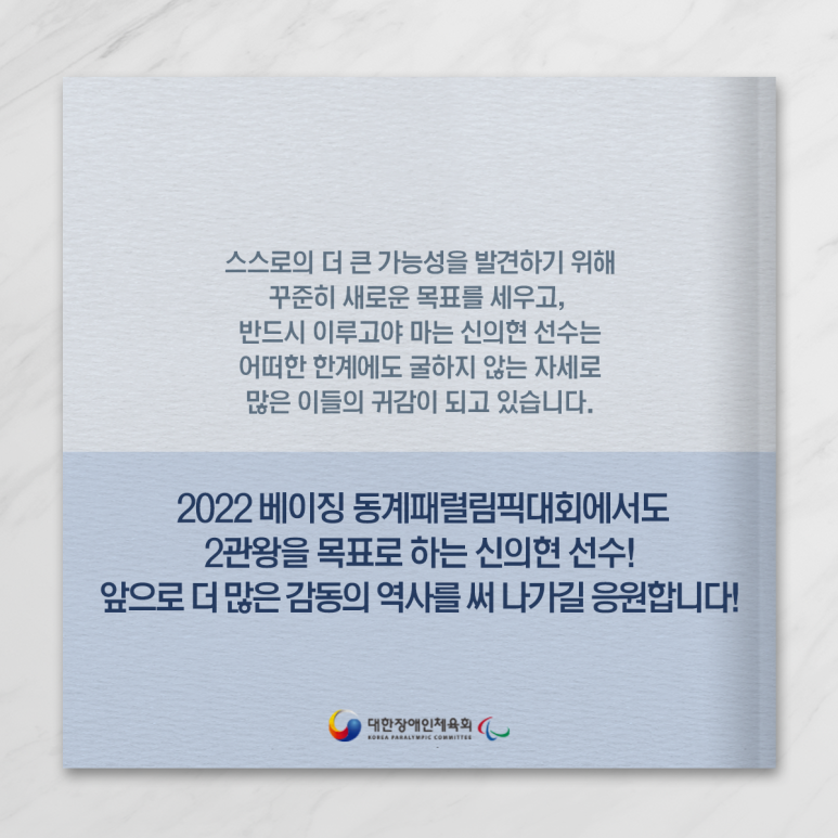 신의현 선수는 어떠한 한계에도 굴하지 않는 자세로 많은 이들의 귀감이 되고 있습니다.