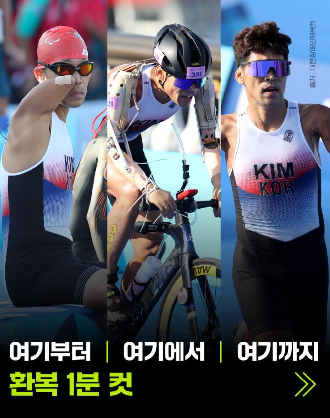 파라트라이애슬론은 수영 750M -> 사이클 20KM -> 달리기 5KM 세 종목을 소화하는 경기입니다.
