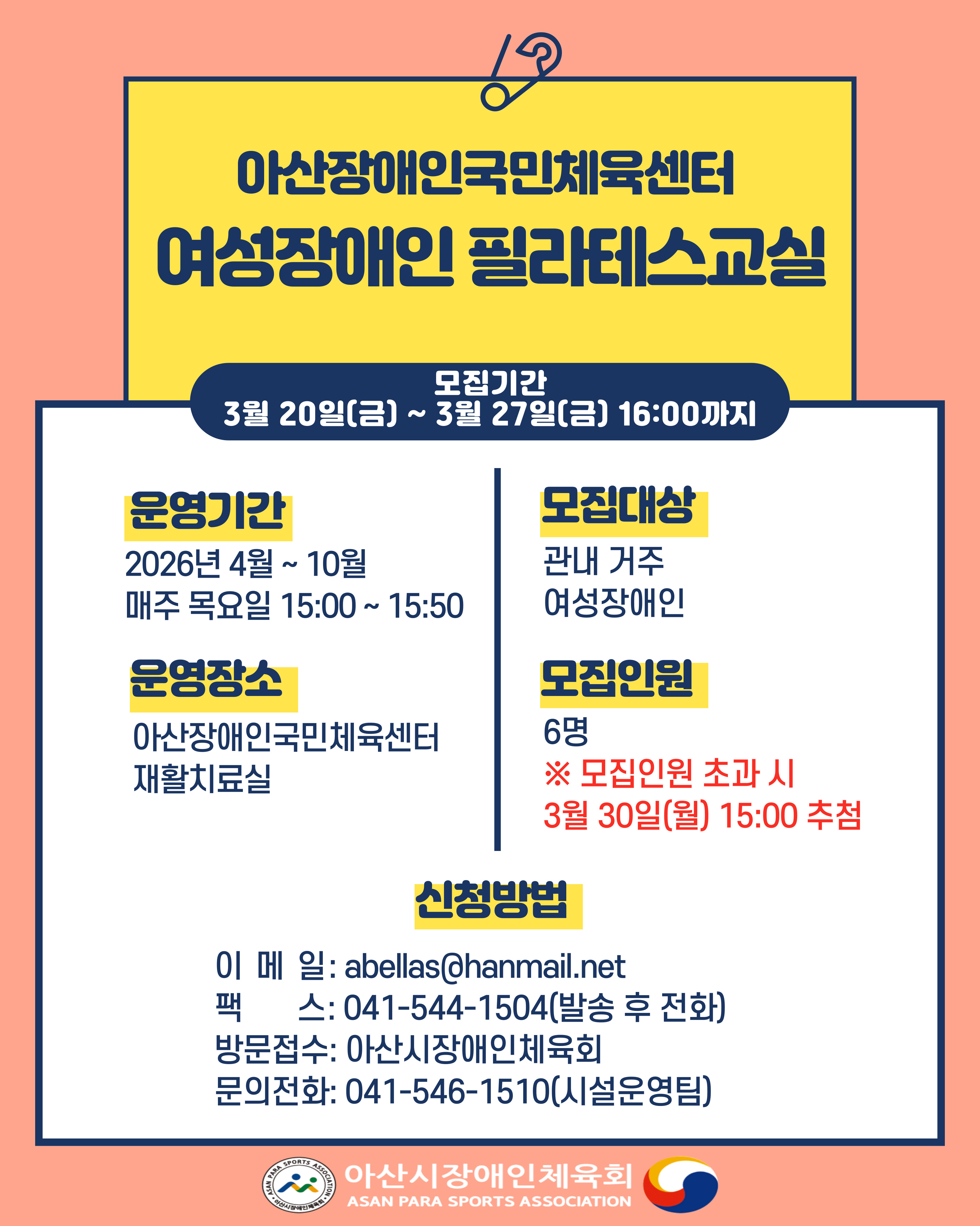 2026년 아산장애인국민체육센터 여성장애인 필라테스교실 프로그램 참가자 모집을