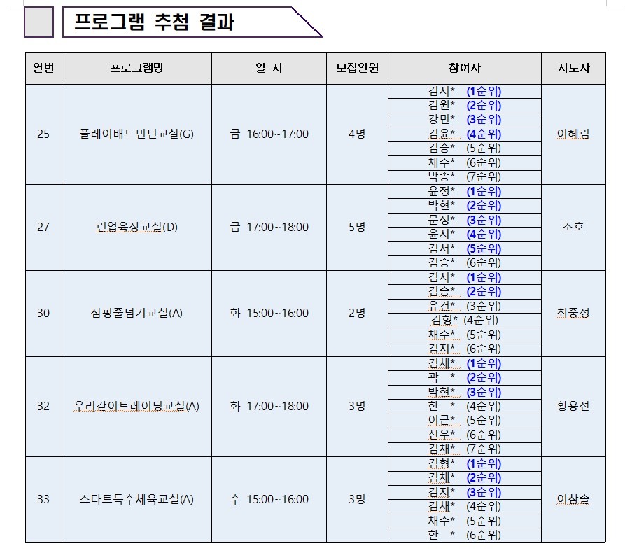 아산장애인국민체육센터 2021년 상반기 프로그램 참여자 추첨결과