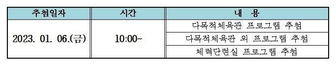 - 상황에(대회 개최, 대관, 교육 등) 따라 프로그램 휴강 및 일정이 변동될 수 있음
