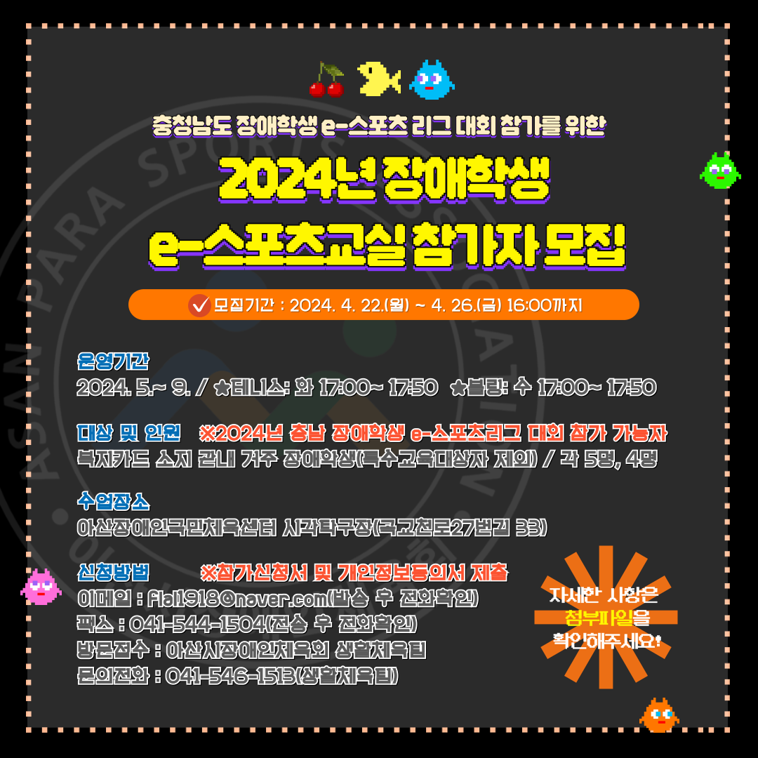- 방문접수: 아산시장애인체육회 사무실 (아산시 곡교천로 27번길 33)
