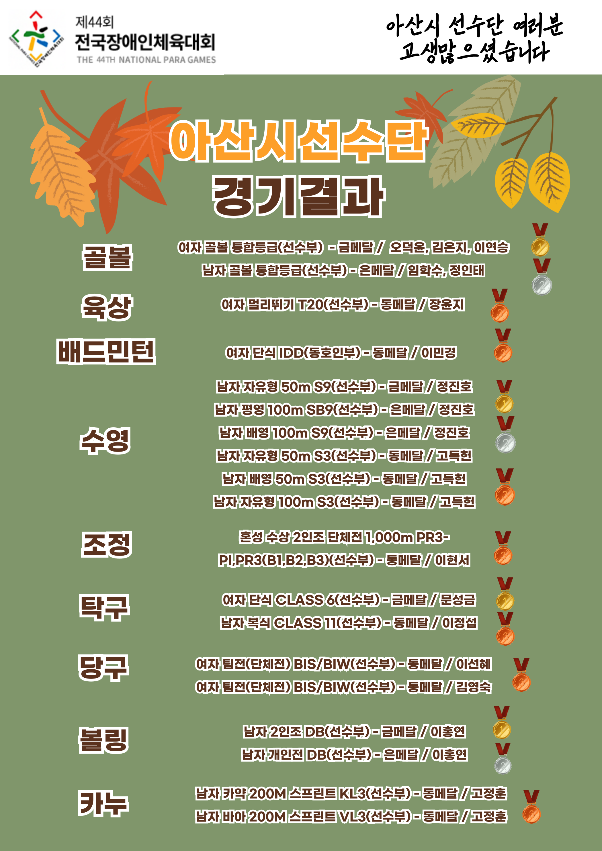 제44회 전국장애인체육대회 <아산시 선수단> 입상소식 전해드립니다