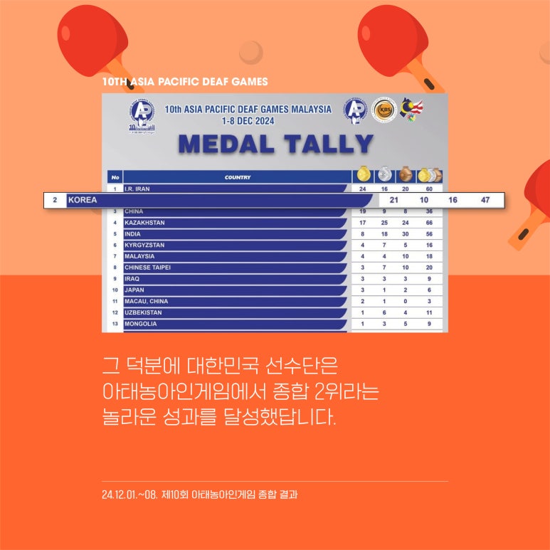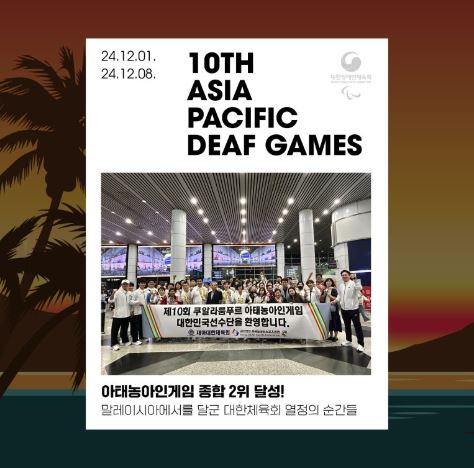 제10회 아시아태평양농아인게임에서 대한민국 선수단이 종합 2위를 달성했습니다.