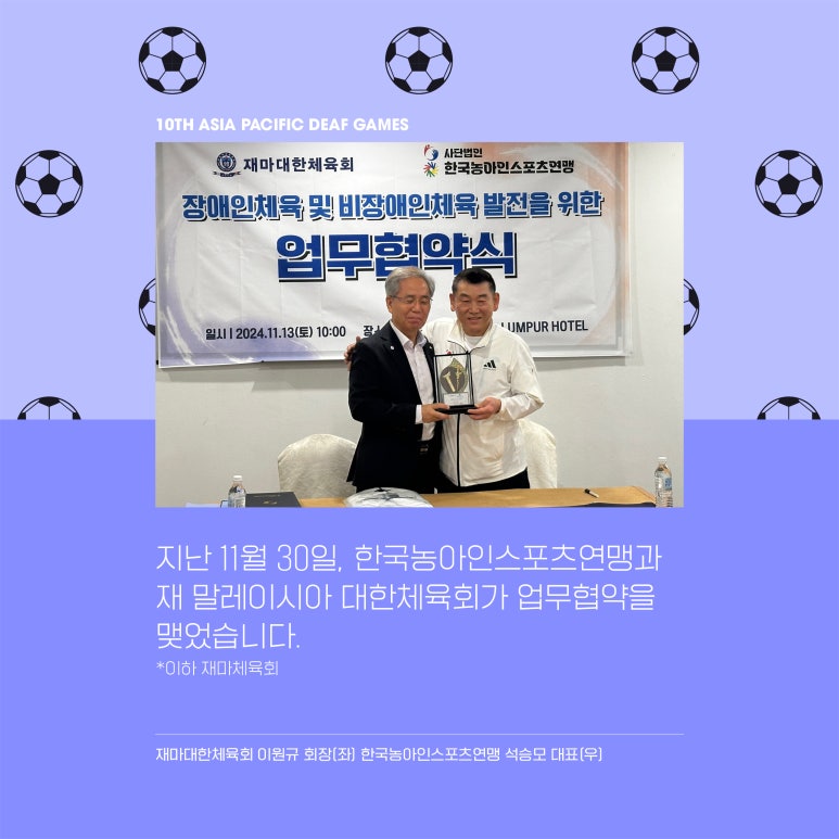 지난 11월 30일, 한국농아인스포츠연맹과 재 말레이시아 대한체육회가
