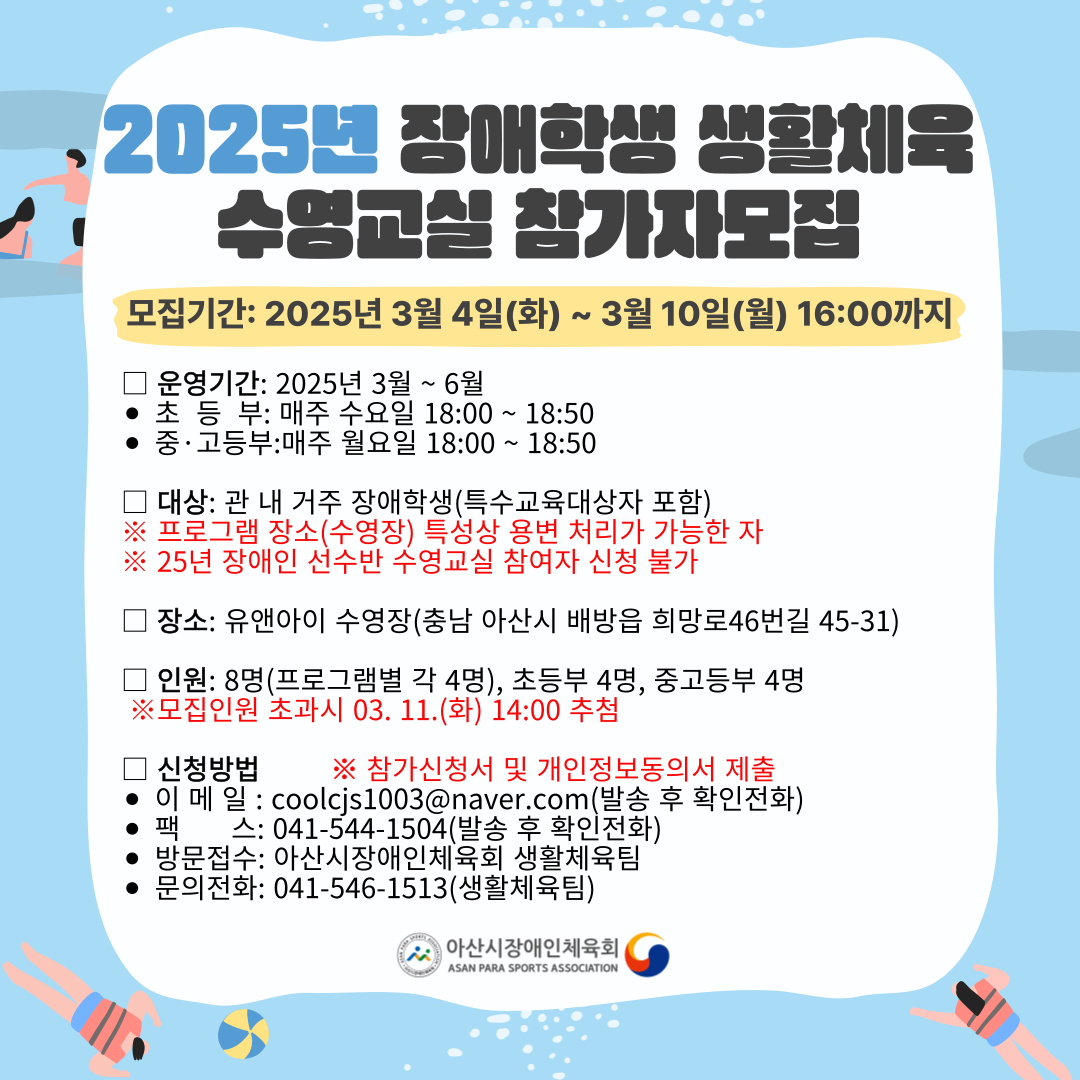2025년 장애학생 생활체육 수영교실 참가자모집합니다.