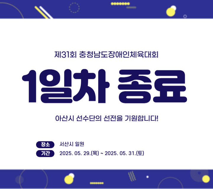 오늘 5월 29일 목요일, 서산시 일원에서 제31회 충청남도장애인체육대회가 개최되었습니다. 첫 날부터 개인종목에서 메달을 휩쓸고 온 우리 아산시 선수단! 앞으로 얼마나 멋진 활약을 펼칠 지 가늠할 수 없을 정도랍니다.