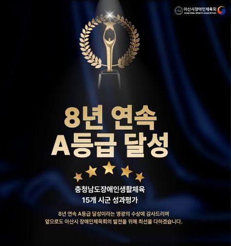 또한, 충청남도장애인체육회 주관 '시·군 장애인생활체육 성과평가'에서 8년 연속 A등급이라는 대기록을 달성하였습니다.