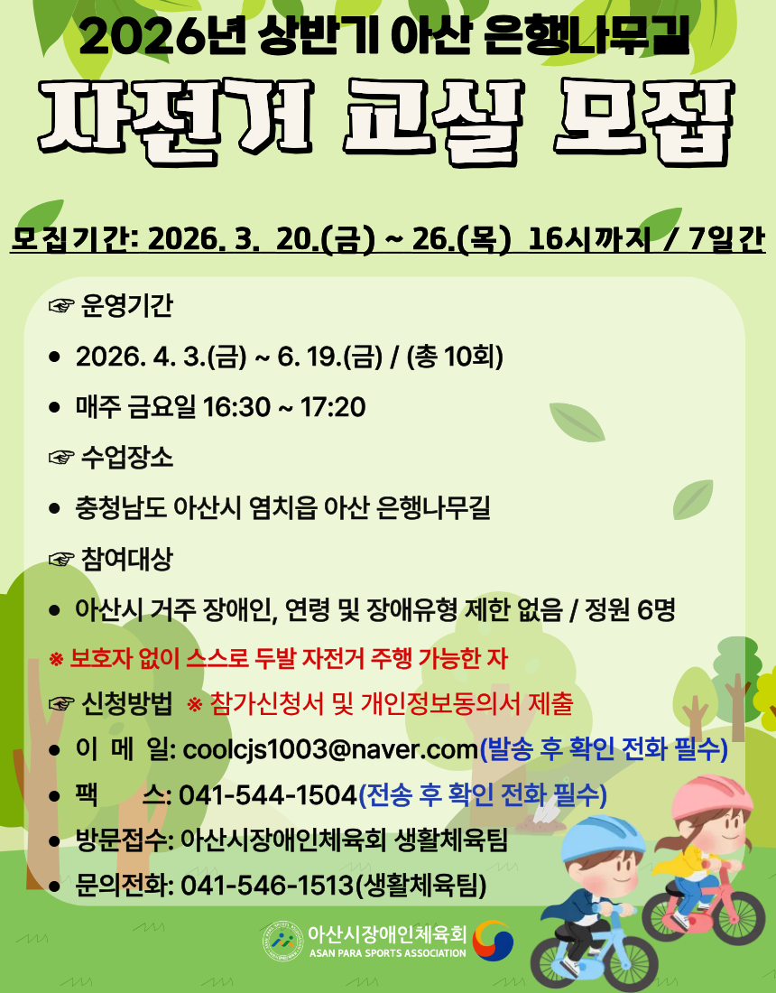 2026년 상반기 아산 은행나무길 자전거교실 참가자 모집 안내